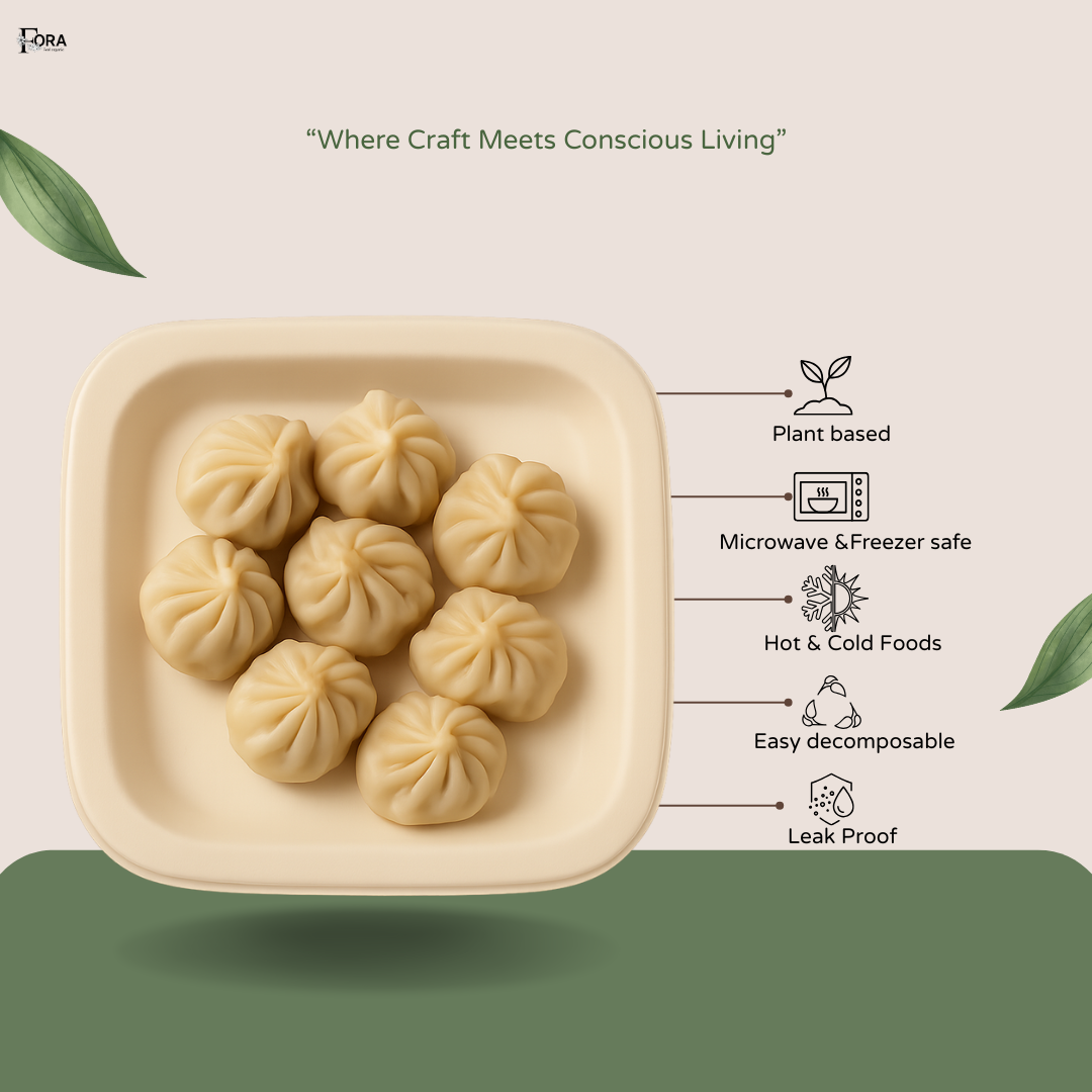 Appetizers, finger foods, sweets, momos, and small servings at parties, cafes, food stalls, or eco-conscious events.